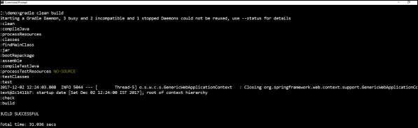 buildscript { ext { springBootVersion = '1.5.8.RELEASE' } repositories { mavenCentral() } dependencies { classpath("org.springframework.boot:spring-boot-gradle-plugin:${springBootVersion}") }}apply plugin: 'java'apply plugin: 'eclipse'apply plugin: 'org.springframework.boot'group = 'com.tutorialspoint'version = '0.0.1-SNAPSHOT'sourceCompatibility = 1.8repositories { mavenCentral()}dependencies { compile('org.springframework.boot:spring-boot-starter-web') testCompile('org.springframework.boot:spring-boot-starter-test')}