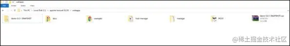 现在,运行 Tomcat 服务器,在 webapps 目录下部署 WAR 文件,如下图所示: