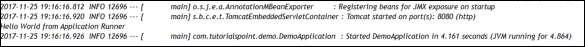 package com.tutorialspoint.demo;import org.springframework.boot.ApplicationArguments;import org.springframework.boot.ApplicationRunner;import org.springframework.boot.SpringApplication;import org.springframework.boot.autoconfigure.SpringBootApplication;@SpringBootApplicationpublic class DemoApplication implements ApplicationRunner { public static void main(String[] args) { SpringApplication.run(DemoApplication.class, args); } @Override public void run(ApplicationArguments arg0) throws Exception { System.out.println("Hello World from Application Runner"); }}