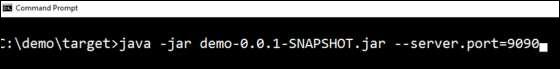 Spring Boot 应用将命令行属性转换为 Spring Boot 环境属性。命令行属性优先于其他属性源。Spring Boot 默认使用 8080 端口号启动 Tomcat。让我们学习如何使用命令行属性改变它。
