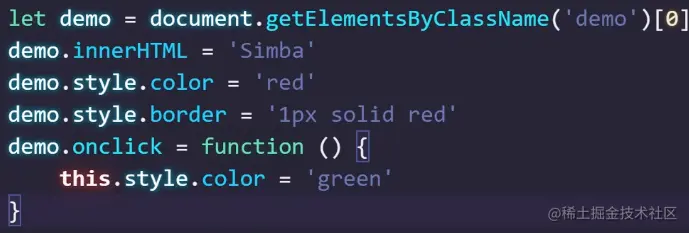 $('.demo').html('Simba').css('color','red').css('border','1px solid red').css('cursor','pointer').click(function(){