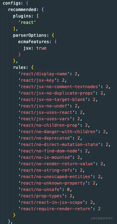 这样我们相当于使用了一份 ESLint 推荐的配置,对于其中不符合具体项目开发的 rule 在 rules 中重新定义即可。ESLint 默认提供 recomanded 和 all 两份配置,具体的配置内容看这里。除了 ESlint 官方提供的配置,一般 plugin 也会提供相应的配置方便开发者使用,例如 eslint-plugin-react 的配置为:
