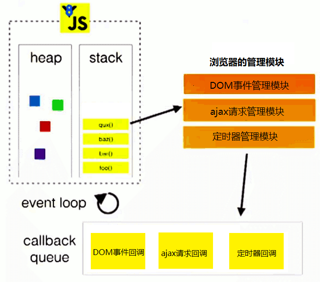 - 当事件发生时, 管理模块会将回调函数及其数据添加到回调列队中