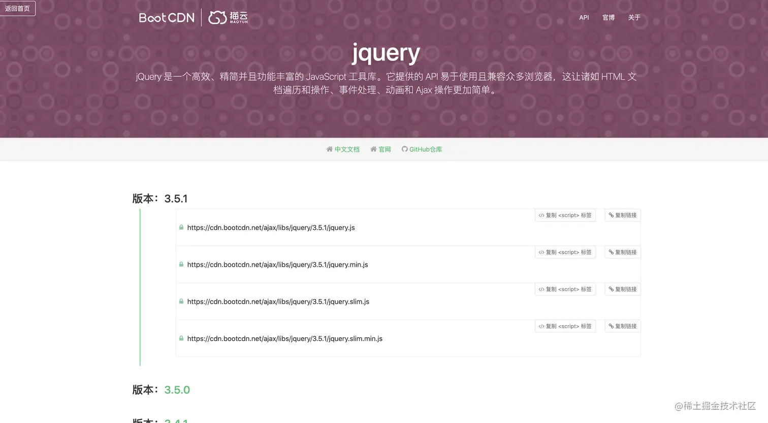 首先在BootCDN的官网里找到jQuery,它有很多版本目前可能是每半年更新一次,直接复制在js之前引用就可以了。