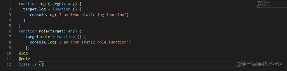 上面的示例,我们装饰了一个类,装饰器本身就是一个函数实现,在装饰类的情况下,只会有构造函数一个参数,并且不能在装饰的情况下传参,注意执行顺序是自下向上的,也就是先执行role,再执行log。