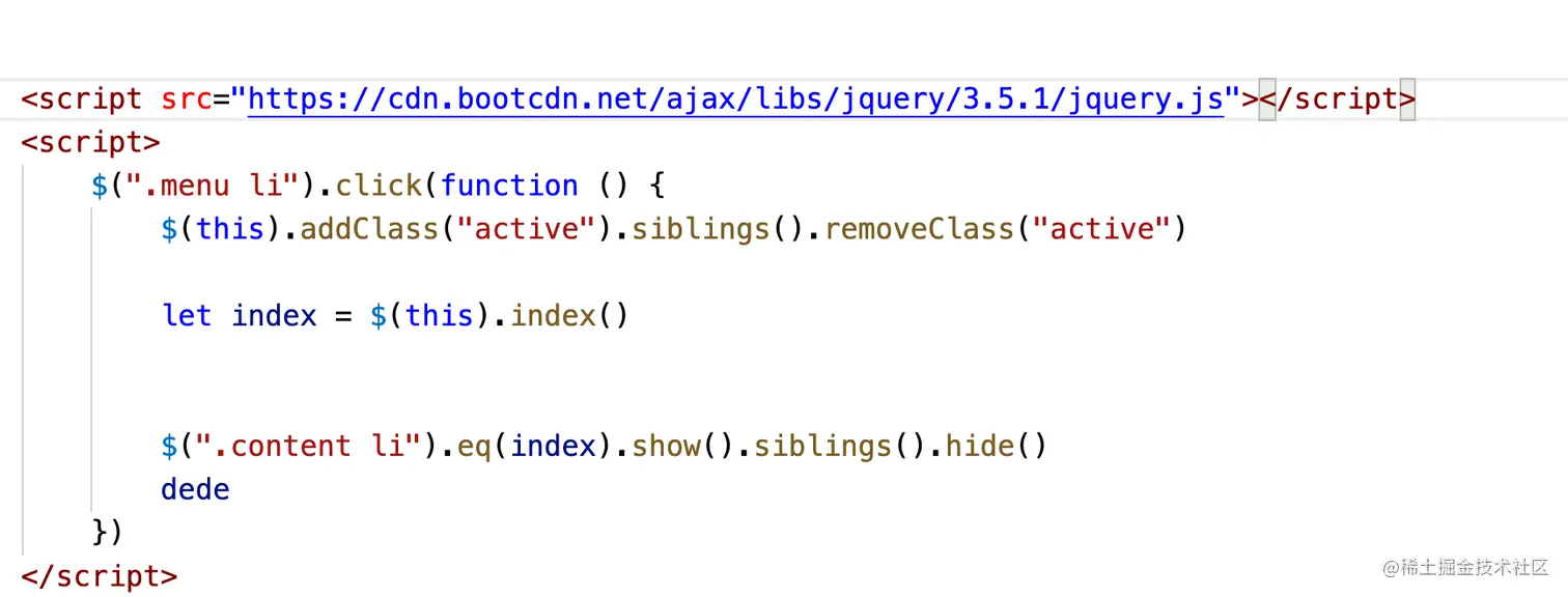 [<script src="https://cdn.bootcdn.net/ajax/libs/jquery/3.5.1/jquery.js"></script>](https://cdn.bootcdn.net/ajax/libs/jquery/3.5.1/jquery.js) <script> $(".menu li").click(function () { $(this).addClass("active").siblings().removeClass("active") let index =$(this).index() $(".content li").eq(index).show().siblings().hide() }) </script>