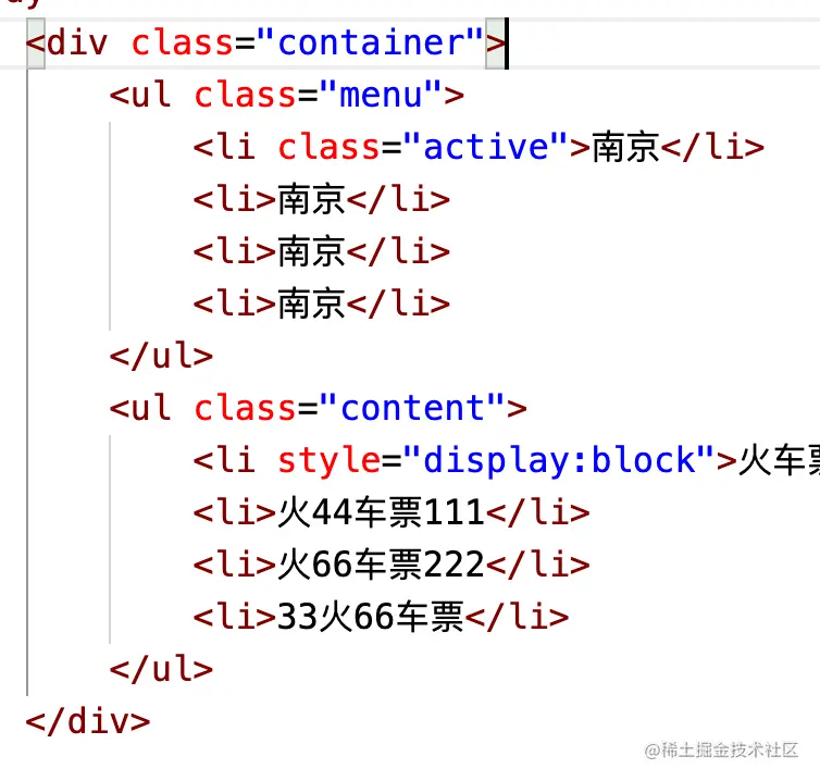 <div class="container"> <ul class="menu"> <li class="active">杭州</li> <li>杭州</li> <li>杭州</li> <li>杭州</li> </ul> <ul class="content"> <li style="display: block;">火55车票</li> <li>火44车票111</li> <li>火66车票222</li> <li>33火66车票</li> </ul> </div>