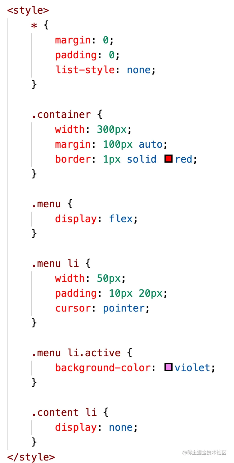<style> * { margin: 0; padding: 0; list-style: none; } .container { width: 300px; margin: 100px auto; border: 1px solid red; } .menu { display: flex; } .menu li { width: 50px; padding: 10px 20px; cursor: pointer; } .menu li.active { background-color: violet; } .content li { display: none; } </style>