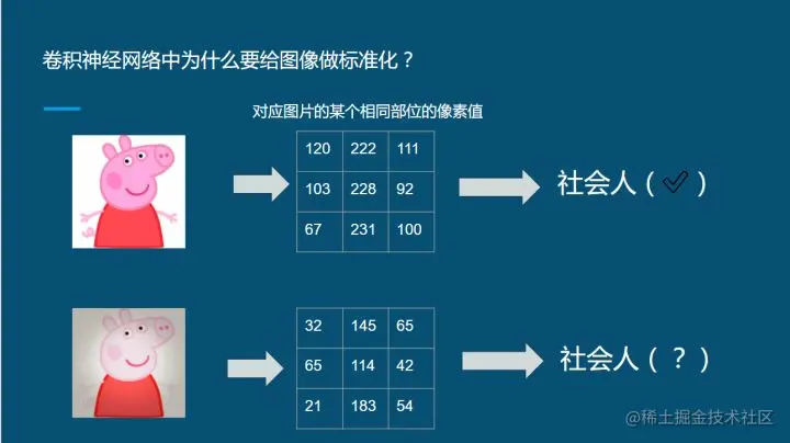 大家看上面两只猪,对于人来说,它就是两只一样的猪,只是图片的灰度或者曝光度不一样罢了,于是我们都给它们都标注为“社会人”。 虽然我们人眼看起来没有什么毛病,但是对于CNN网络来说,他们的特征很可能不同。这时候一般会对图片事先进行一个Z-Score的标准化(减去均值处以标准差,是不是很多朋友都不知道这个方法的学名。) 把不同的图片映射到同一尺度下,因此上述问题就从像素值不同的问题转化成相似的特征分布的问题,一定程度上消除了因为过度曝光,质量不佳,或者噪音等各种原因对模型权值更新的影响。