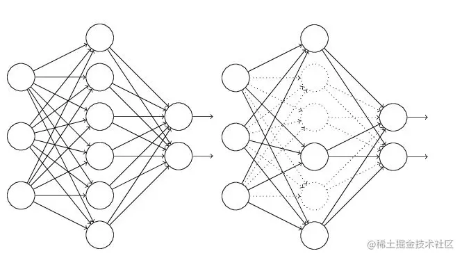如何平衡训练和测试时的差异呢?在训练时以一定的概率使神经元失活,实际上就是让对应神经元的输出为0。假设失活概率为 p ,就是这一层中的每个神经元都有p的概率失活,如下图的三层网络结构中,如果失活概率为0.5,则平均每一次训练有3个神经元失活,所以输出层每个神经元只有3个输入,而实际测试时是不会有dropout的,输出层每个神经元都有6个输入,这样在训练和测试时,输出层每个神经元的输入和的期望会有量级上的差异。因此在训练时还要对第二层的输出数据除以(1-p)之后再传给输出层神经元,作为神经元失活的补偿,以使得在训练时和测试时每一层输入有大致相同的期望。