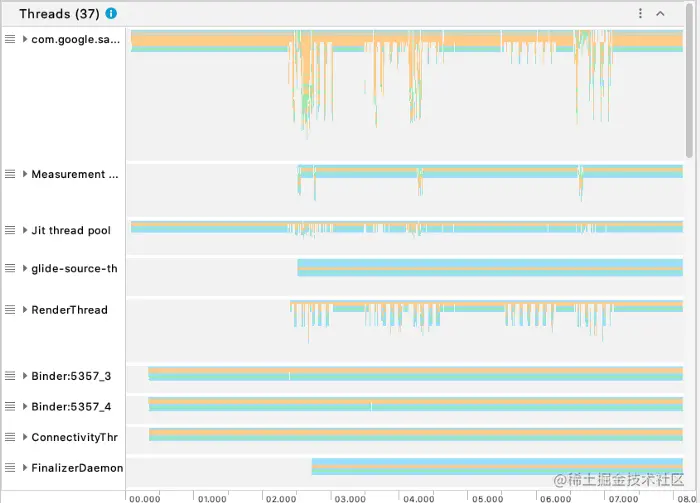 你也可以通过单击三角形图标或双击线程名称来折叠或展开每个线程。需要注意的是,对于Java方法跟踪或C/C++函数跟踪,由于调用堆栈较深,我们默认折叠所有线程,这样你可以在前面对所有线程数据一目了然。