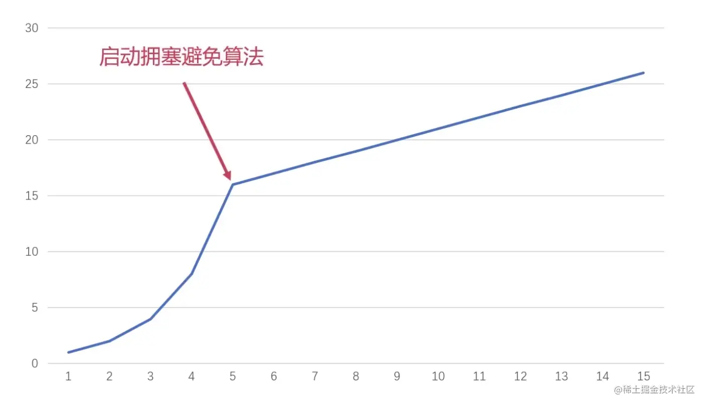 在到达阈值之前,数据报文的数量是指数增长的。当数据报文的数量达到阈值的时候就会启动拥塞避免算法,之后数据报文的数量就是线性增长的