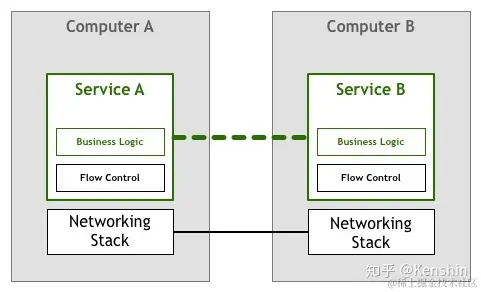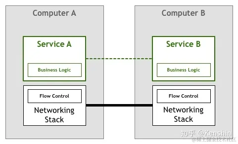 然而现实远比想象的复杂,在实际情况中,通信需要底层能够传输字节码和电子信号的物理层来完成,在TCP协议出现之前,服务需要自己处理网络通信所面临的丢包、乱序、重试等一系列流控问题,因此服务实现中,除了业务逻辑外,还夹杂着对网络传输问题的处理逻辑。
