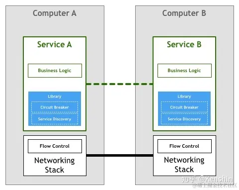 在TCP出现之后,机器之间的网络通信不再是一个难题,以GFS/BigTable/MapReduce为代表的分布式系统得以蓬勃发展。这时,分布式系统特有的通信语义又出现了,如熔断策略、负载均衡、服务发现、认证和授权、quota限制、trace和监控等等,于是服务根据业务需求来实现一部分所需的通信语义。