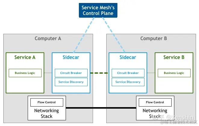 如图是一个简化的Service Mesh架构,服务A和服务B相互调用,不再是以前通过微服务框架直接指向的方式,而是在中间加了两个叫做Sidecar(边车)的东西,各种服务都在这里处理数据上的逻辑。Sidecar的作用是数据面的代理,它是更贴近于数据的;而Sidecar不能完全不受控,上面控制它的就叫做控制面。
