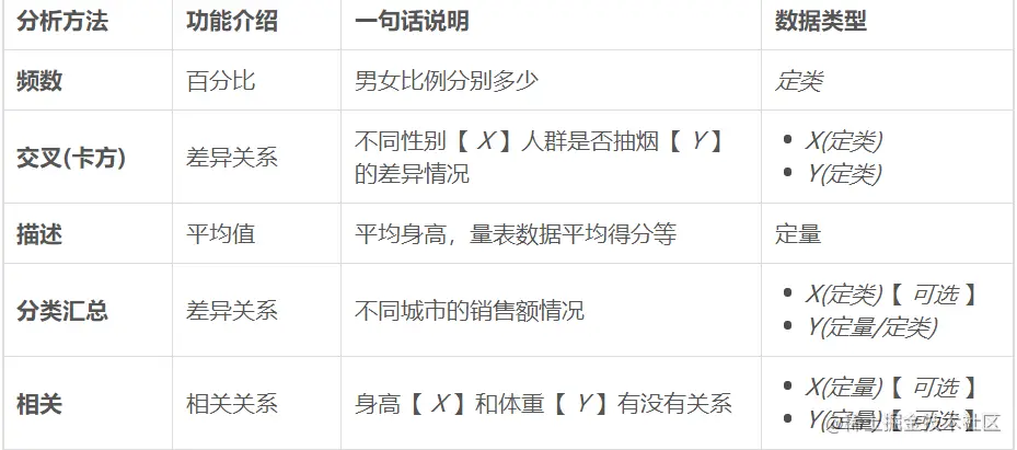- 其实核心的区别在于:数据类型不一样。如果是定类和定类,此时应该使用卡方分析(可用对应分析进行可视化!);如果是定类和定量,此时应该使用方差或者T检验。