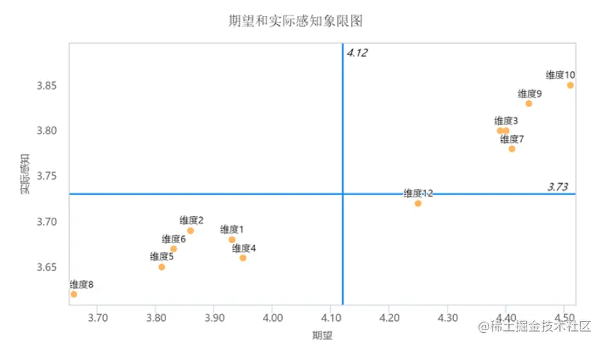 上图为输出结果情况,上图显示,大部分维度均在第一象限或者第四象限。维度12在第四象限。第一象限意味着期望高并且实际感知也很高;第三象限意味着期望较低同时实际感知也较低;整体上说明用户的期望与实际感知情况比较吻合,用户期望高的维度被满足,期望较低的维度也对应着相同的满意度。