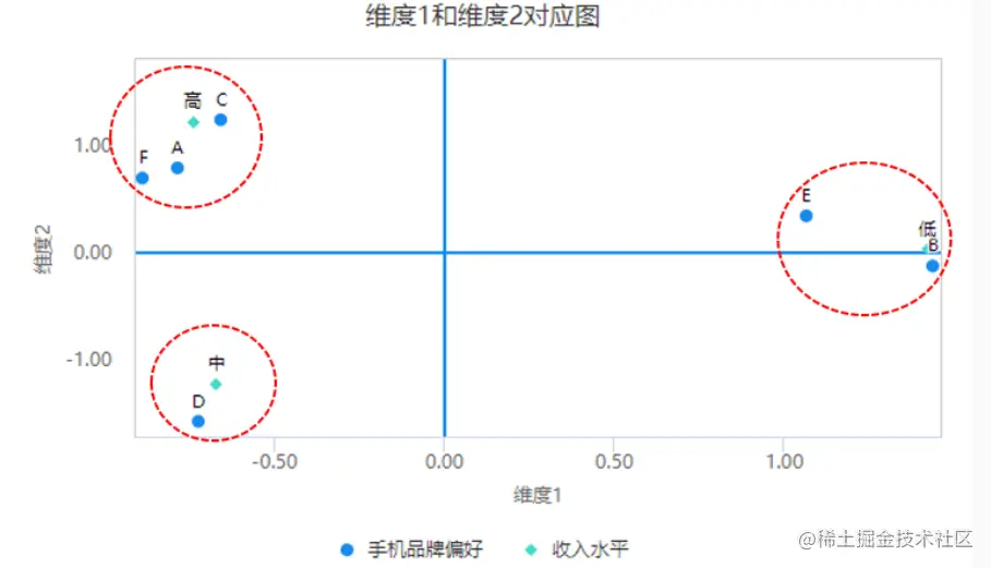 通过分析可知:收入与手机品牌偏好之间,可细分出3个市场;低收入群体偏好于B、E品牌手机;中收入群体偏好于D品牌手机;高收入群体偏好于A、C、F三个手机品
