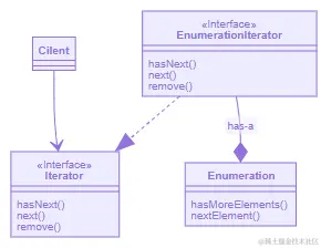 可以看见适配器适配得并不完美,但这没有办法,毕竟Enumeration不是一个Iterator,只能选择在remove()方法直接抛出了一个未获支持操作异常UnsupportedOperationException,做出一个文档说明,让客户在使用的时候小心就没有太大问题。