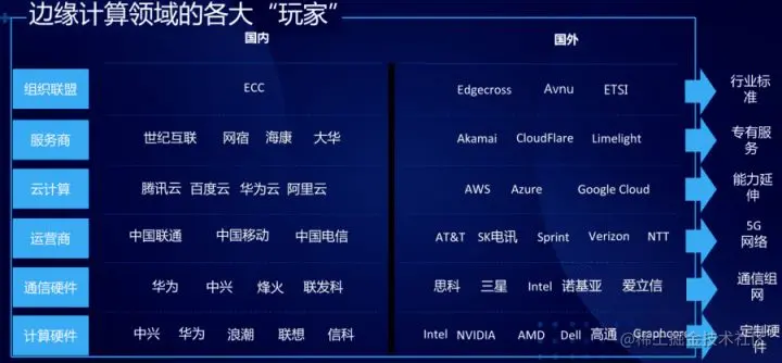 在现今的云市场,云计算的巨头依托先发优势大力发展边缘计算,将云计算技术下沉到边缘侧,下沉的云计算不一定非要由云服务商来提供,大型IT服务商都可独立开发边缘框架,只要能够连接云服务,谁都可以提供给边缘服务。工业企业依托丰富的工业场景,也在开展边缘计算的实践;电信运营商为迎接5G的市场机遇,全面部署边缘节点,为布局5G基础设施打好基础。