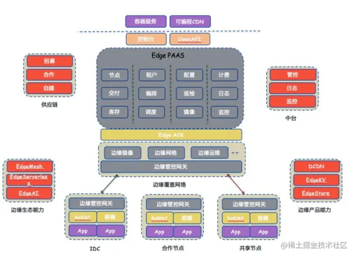 边缘融合的计算平台,融合是指在边缘的基础设施如MEC、IDC等资源上做融合。也有在计算形态、提供形式以及运维方面的融合。边缘节点服务需要满足业务的弹性,较强的突发需求应变能力,高资源利用率。需要DDoS防护、主机安全保障,应对软硬件故障对业务带来的稳定性风险。在提供高可靠性服务的同时可做到问题的秒级发现和处理,支持通过体系化、自动化的运维使工作效率大幅提升。