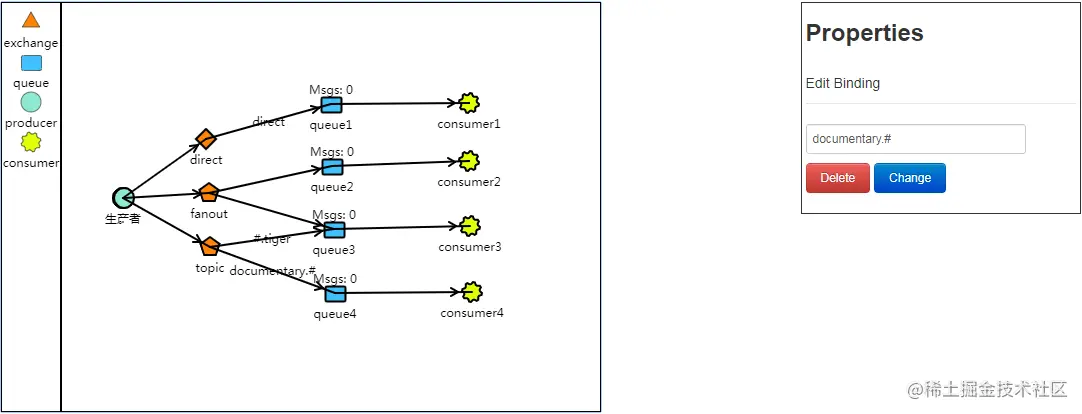路由键为documentary.lion的消息仅被发送到绑定键为:documentary.#的队列,#.tiger的队列