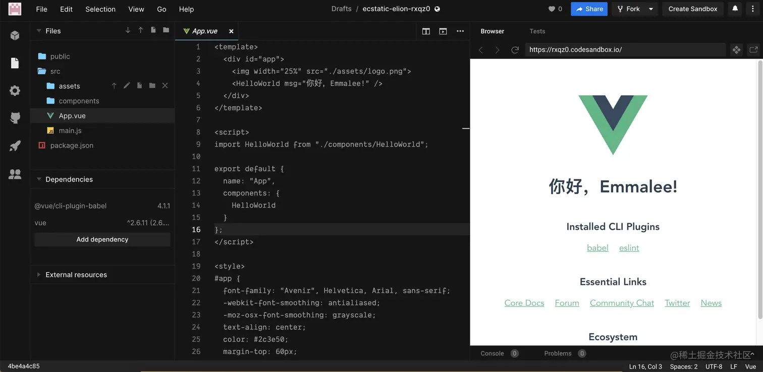 再点击create Sandbox后选择Vue template可以看到如下界面: