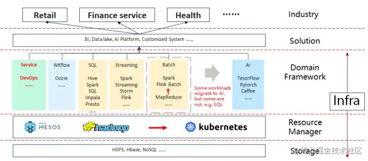 但随着各个领域框架集群的不断扩大,以及单个业务的波动性,各个子集群的资源浪费比较严重;因此**越来越多的用户希望通过统一调度系统来解决资源共享的问题。**在技术选型上,Kubernetes凭借其优秀的扩展性获得大部分用户青睐。