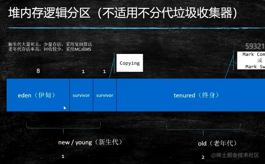 复制收集算法在对象存活率较高时就要执行较多的复制操作,效率将会变低。更关键的是,如果不想浪费50%的空间,就需要有额外的空间进行分配担保,以应对被使用的内存中所有对象都100%存活的极端情况,所以复制算法仅仅应用在新生代,而老年代一般不能直接选用这种算法,使用标记-压缩法。
