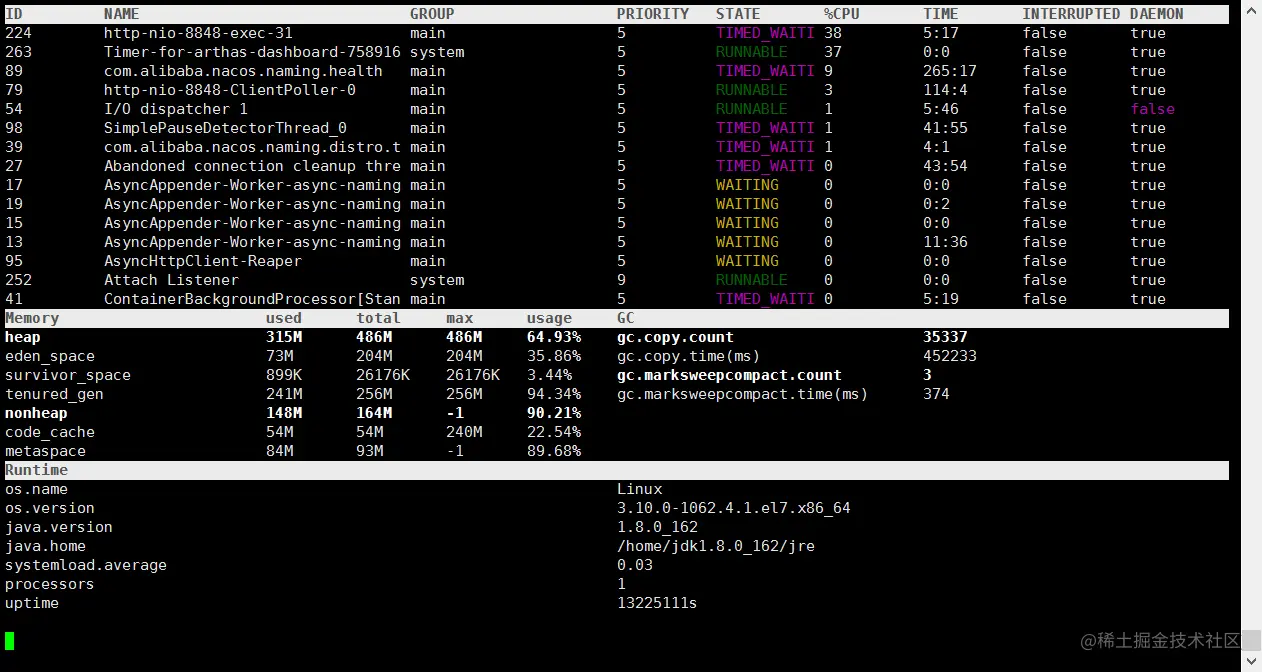 通过仪表盘工具查看线程的信息,可以看到线程的id、名称、组、优先级、cpu、运行时间等