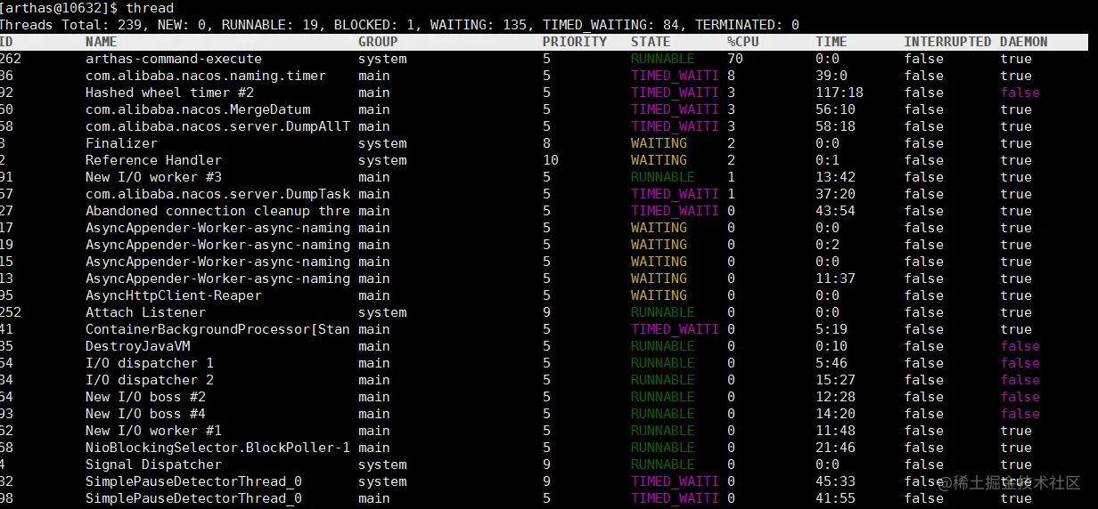 [root@instance-m33tfvmh ~]# java -jar arthas-boot.jar[INFO] arthas-boot version: 3.3.9[INFO] Found existing java process, please choose one and input the serial number of the process, eg : 1\. Then hit ENTER.* [1]: 10632 /soft/nacos/target/nacos-server.jar1[INFO] Start download arthas from remote server: https://arthas.aliyun.com/download/3.3.9?mirror=aliyun[INFO] File size: 11.44 MB, downloaded size: 2.05 MB, downloading ...[INFO] File size: 11.44 MB, downloaded size: 4.26 MB, downloading ...[INFO] File size: 11.44 MB, downloaded size: 6.05 MB, downloading ...[INFO] File size: 11.44 MB, downloaded size: 7.44 MB, downloading ...[INFO] File size: 11.44 MB, downloaded size: 9.32 MB, downloading ...[INFO] File size: 11.44 MB, downloaded size: 11.20 MB, downloading ...[INFO] Download arthas success.[INFO] arthas home: /root/.arthas/lib/3.3.9/arthas[INFO] Try to attach process 10632[INFO] Attach process 10632 success.[INFO] arthas-client connect 127.0.0.1 3658 ,---. ,------. ,--------.,--. ,--. ,---. ,---. / O \ | .--. ''--. .--'| '--' | / O \ ' .-' | .-. || '--'.' | | | .--. || .-. |`. `-. | | | || |\ \ | | | | | || | | |.-' | `--' `--'`--' '--' `--' `--' `--'`--' `--'`-----' wiki https://arthas.aliyun.com/doc tutorials https://arthas.aliyun.com/doc/arthas-tutorials.html version 3.3.9 pid 10632 time 2020-08-17 21:34:19 [arthas@10632]$