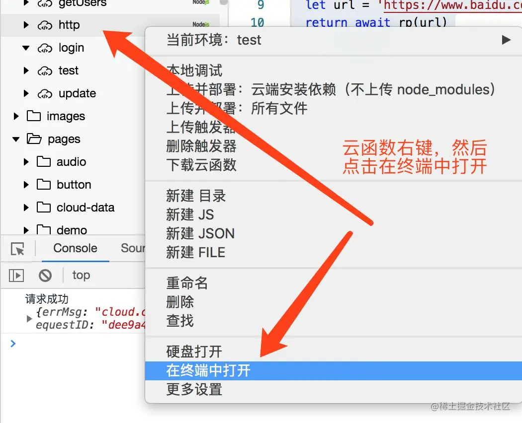 1, 右键我们的云函数,然后点击在终端中打开
