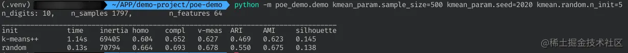 如上,我们把sample_size和seed和k写进配置文件的kmean_param中,把不同的初始化方法写在kmean中。运行结果如下:
