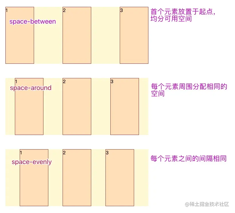 space-evenly:均匀排列每个元素,每个元素之间的间隔相等