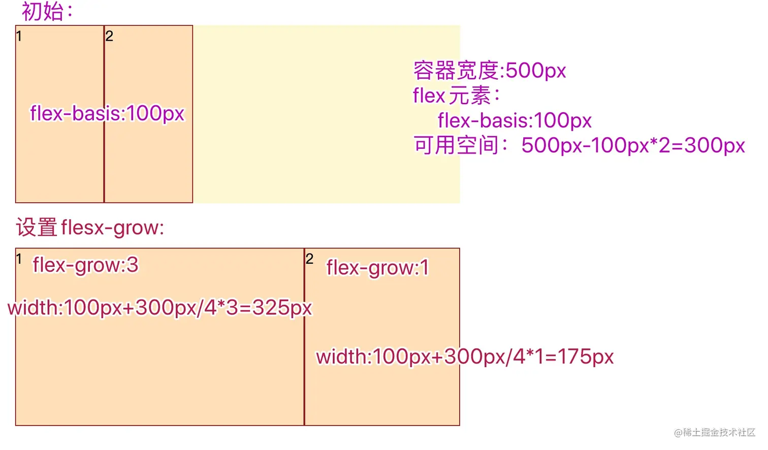 计算方式:如果有两个flex元素分别设置flex-grow为3和1,可用空间将被分成3+1份,一个占3份,一个占1份,并与初始宽度相加。