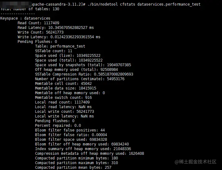 经过上述读取操作的解读之后,接下来查看一下内存使用情况。使用命令./bin/nodetool cfstats keyspace.table可以得到如下结果: