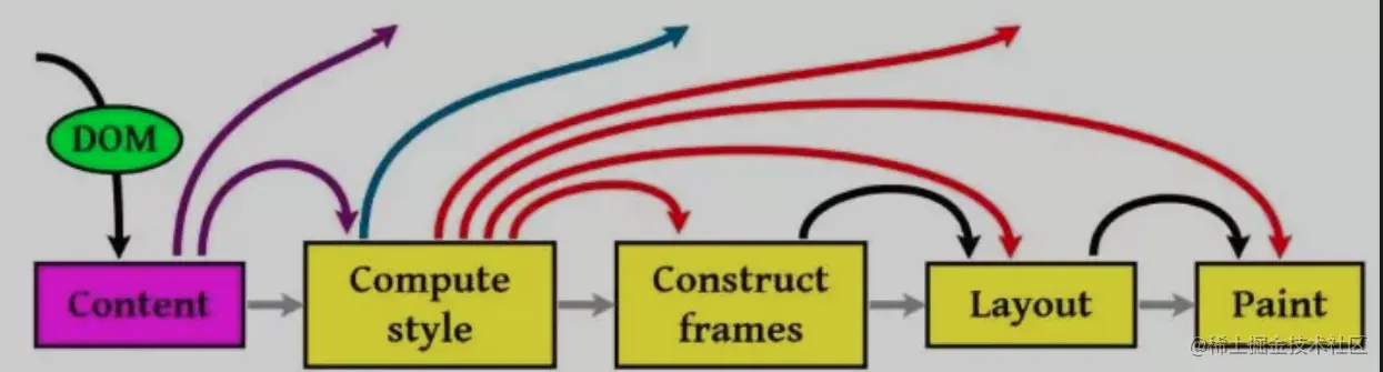 注意:上图流程中有很多连接线,这表示了 Javascript 动态修改了 DOM 属性或是 CSS 属性会导致重新 Layout,但有些改变不会重新 Layout,就是上图中那些指到天上的箭头,比如修改后的 CSS rule 没有被匹配到元素。