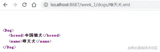 使用URL:http://localhost:8687/week_1/dogs/哮天犬.xml,输出XML: