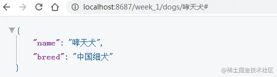 使用URL:http://localhost:8687/week_1/dogs/哮天犬,输出JSON: