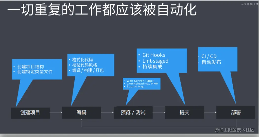 前端工程化体系是一种服务,以项目迭代过程中的前端开发为主要服务对象,设计开发、构建、部署等环节。---------《前端工程化:体系设计与实践》