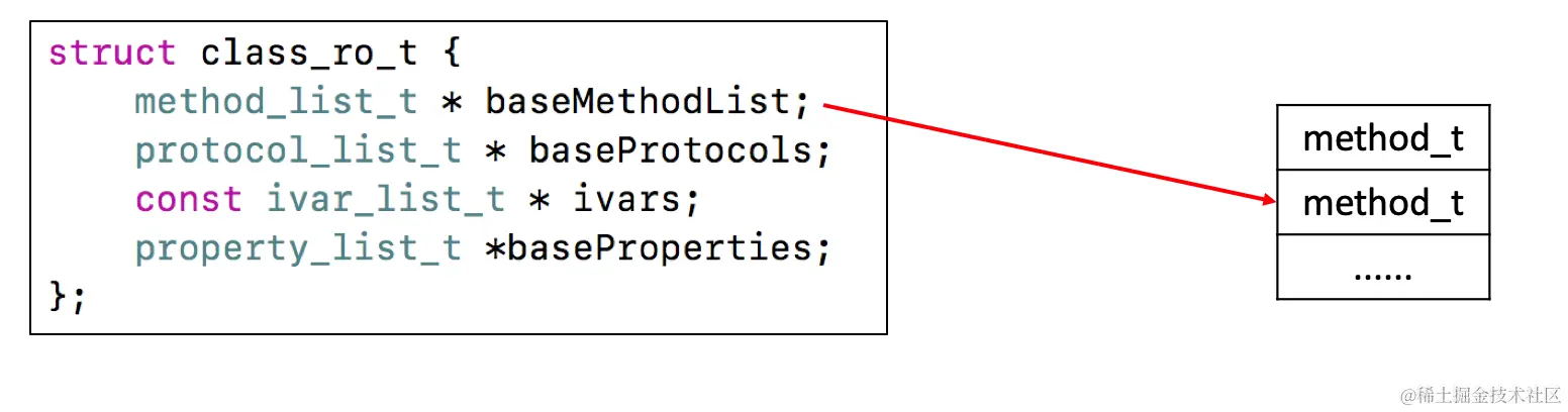 - class_ro_t里面的baseMethodList、baseProtocols、ivars、baseProperties是一维数组,是只读的,包含了类的初始内容