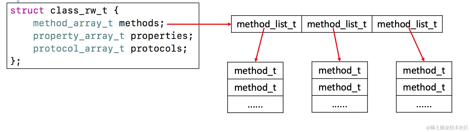 - class_rw_t里面的methods、properties、protocols是二维数组,是可读可写的,包含了类的初始内容、分类的内容