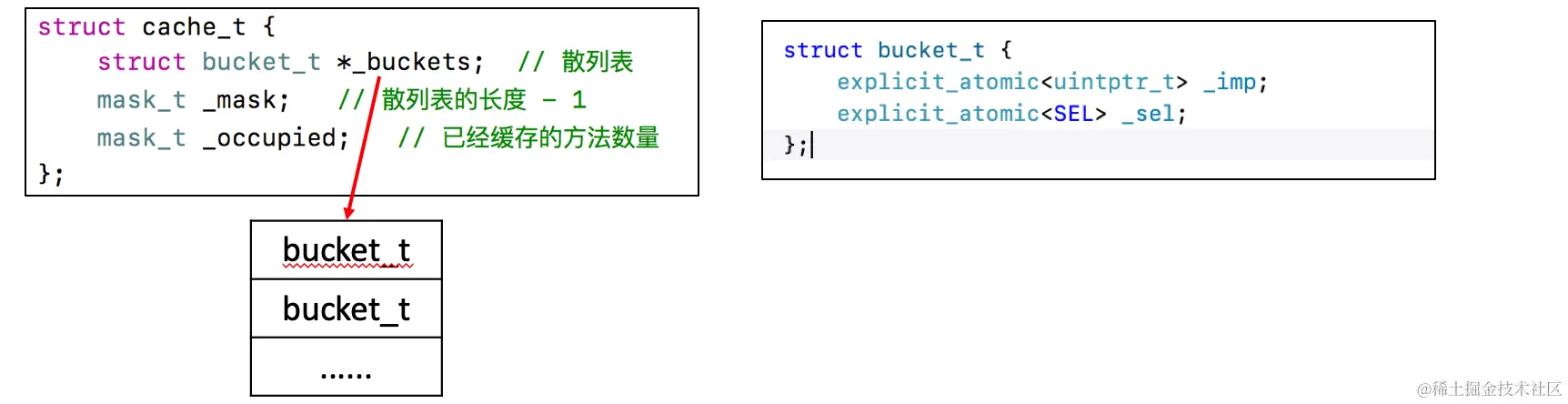 - Class内部结构中有个方法缓存(cache_t),用散列表(哈希表)来缓存曾经调用过的方法,可以提高方法的查找速度