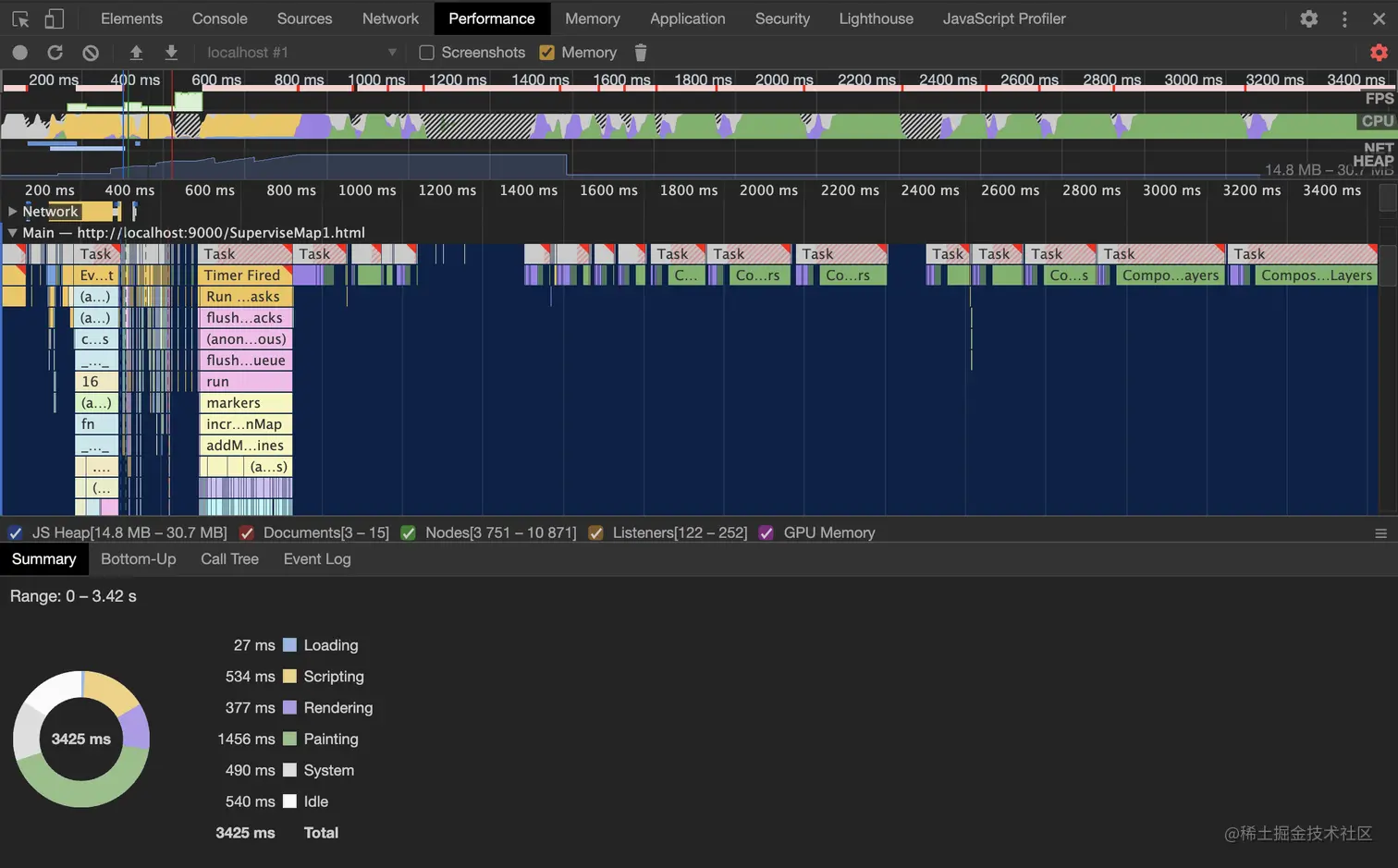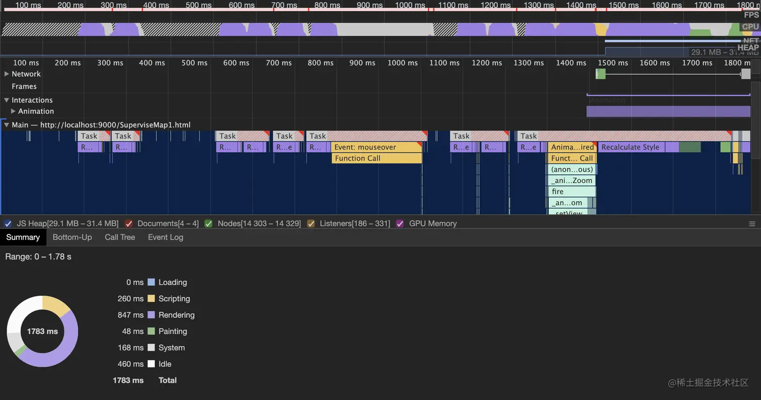 从使用的体验来看,卡顿点主要在两个地方:首次渲染数据时 和 缩放地图时,因此我们使用 Chrome Performance 着重这两个场景分析。