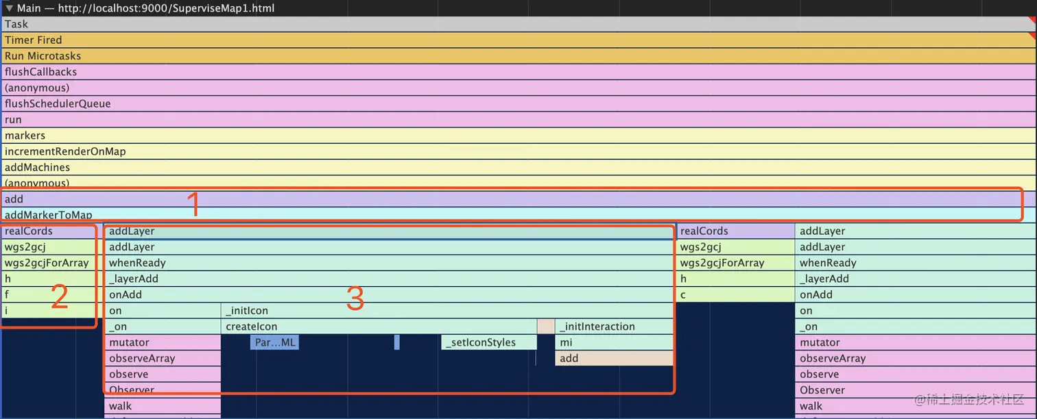 addMarkerToMap方法,该方法的功能是 在地图上添加 Marker。 addMarkerToMap耗时原因主要是由realCords(坐标转换) 和addLayer组成。