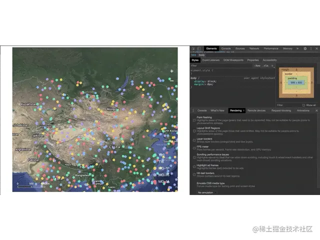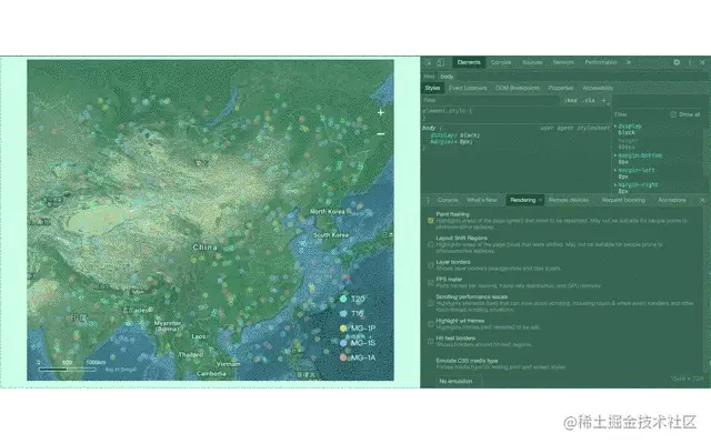 由此可见,通过平移地图并不会影响 Marker 的位置,但是 缩放地图时 会导致重新计算 Marker 位置,并且通过 transform: translate3D(); 来改变 Marker 位置,虽然是在 合成层 上进行的,但是 海量的 Marker 依旧会导致 大量的内存开销 和 CPU 占用。