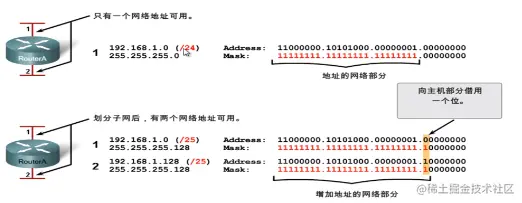 - 使用一个或多个主机位作为网络位创建子网