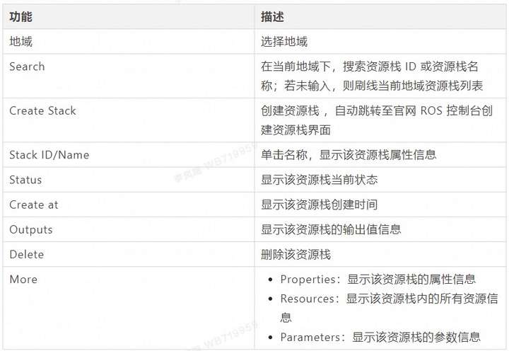 资源栈管理功能操作说明如下表所示: