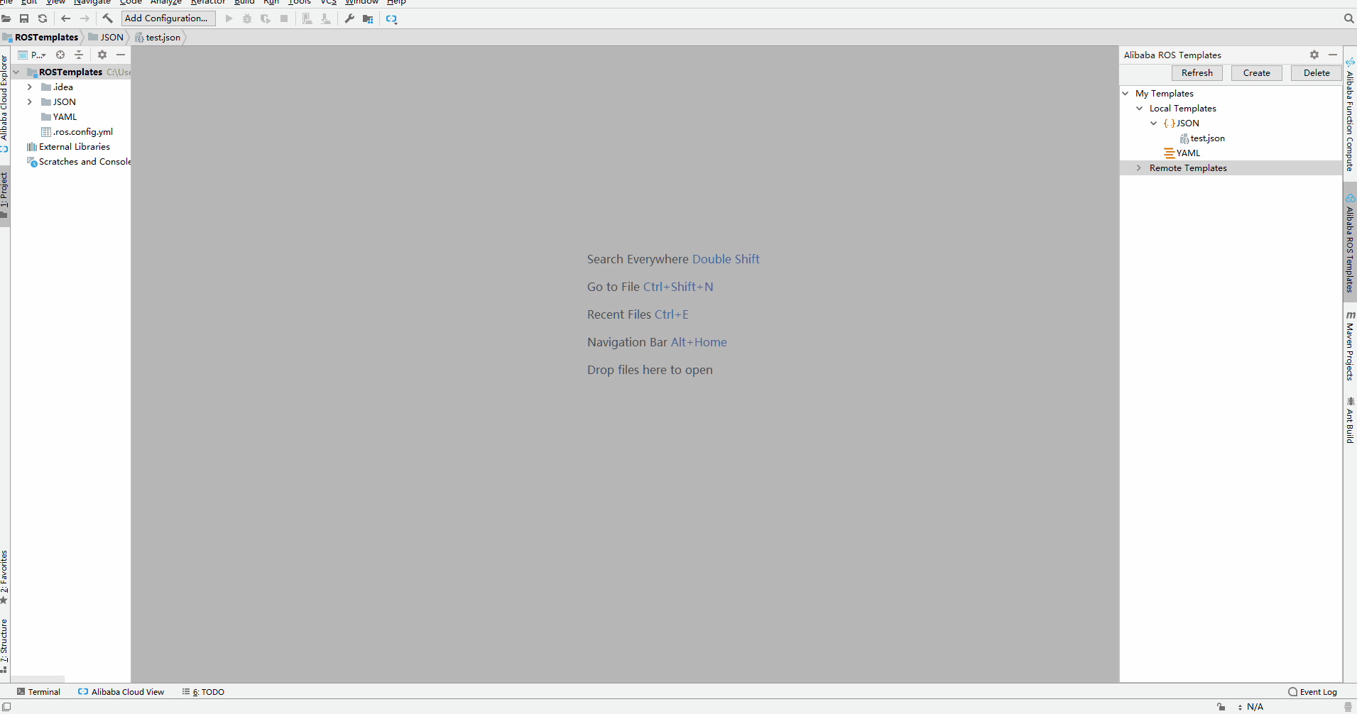 注意:使用这种方式创建的模板不会被 Alibaba ROS Templates 工具管理。如需使用模板工具管理,则需要在 .ros.config.yml 文件中增加模板路径,并将模板移动至 JSON 和 YAML 文件夹下。
