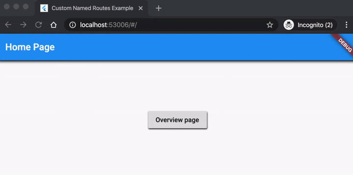 在DartPad上可以看到一个完整的交互式示例。如果你自己构建并运行网络应用,你也可以在网络浏览器中输入/#/overview。这样就会将名为overview的路由推送到Navigator,并将你带到OverviewPagewidget,你可以在下面的GIF中看到。